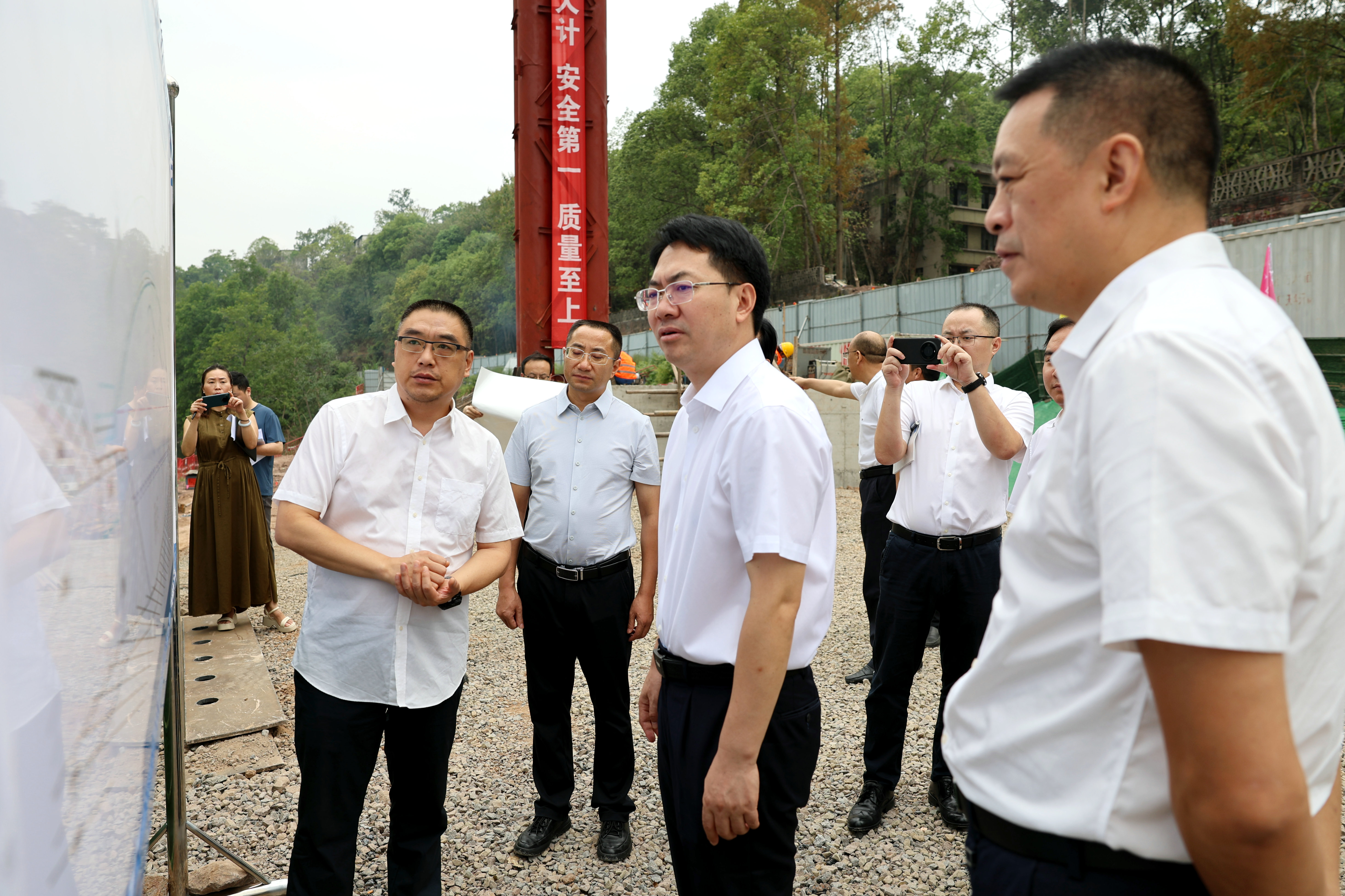 在施工現(xiàn)場,袁洪指出,一是高度重視,提高認識。“引水入竹”是全市重點工程建設項目之一,關(guān)系到大竹人民最關(guān)心、最直接、最現(xiàn)實的利益問題。同時,對改善民生質(zhì)量、促進公平正義、維護社會穩(wěn)定和推動經(jīng)濟可持續(xù)發(fā)展具有重大意義,必須高度重視、全力以赴抓好項目推進。二是強化監(jiān)督、加快進度。要合理調(diào)配資源,優(yōu)化施工組織,加強質(zhì)量檢測和監(jiān)督,從原材料采購到每一個環(huán)節(jié)把好質(zhì)量關(guān),在確保質(zhì)量和安全的前提下,倒排工期、掛圖作戰(zhàn),確保如期完成各項建設任務。三是突出安全、確保穩(wěn)定。要牢固樹立安全意識,加強教育培訓,強化隱患排查和整改,切實提高安全意識和防范能力,堅決杜絕各類事故苗頭出現(xiàn)。同時,國慶將至,又即將面臨旱澇急轉(zhuǎn)的特殊天氣。因此,要嚴格落實24小時值班制度,進一步做好防汛減災工作,強化物資保障,確保安全穩(wěn)定。