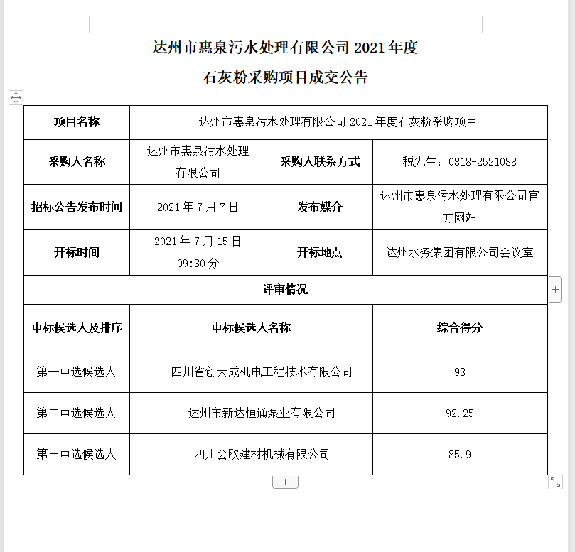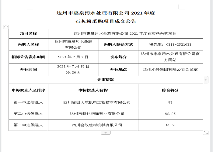 標(biāo)題:達(dá)州市惠泉污水處理有限公司2021年度 石灰粉采購項(xiàng)目成交公告